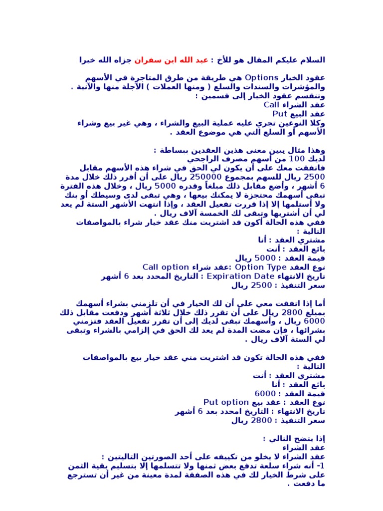الخيار في البيع pdf. تستخدم عقود الخيار أيضا للتحوط ضد المخاطر على سبيل المثال إذا كنت تعتقد أن محفظة أسهمك قد تنخفض قيمتها لكنك لا تريد أن تبيع أرصدتك فإنه يمكنك شراء عقود خيار البيع في صندوق استثمار متداول. إسقاط شرط الخيار في العقد فيقول أحدهما تبايعنا ولا خيار فإن رضي الآخر سقط الخيار قال رسول الله صلى الله عليه. الأصل في عقد البيع أنه إذا وجدت أركانه وتحققت شروطه أن ينعقد. مقابلة شيء بشيء فمقابلة السلعة بالسلعة تسمى بيع ا لغة كمقابلتها بالنقد ويقال لأحد المتقابلين.