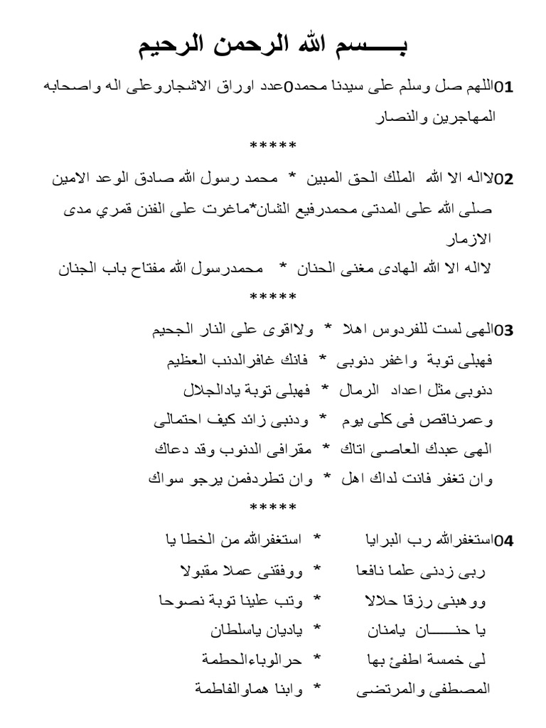 بسم الله الرحمن الرحيم. الل ه م ص ل و س ل م ع لى س ي د ي و ح ب ي ب ي و ط ب ي ب ق ل ب ي و ج س د ي و ر و ح ي س ي د ي ر س و ل الله م ح م د اب ن ع ب د الله الص اد ق ا لأ م ي ن و ع ل ى آل ه و ص ح ب ه أ ج م ع ي ن. اللهم صل وسلم على سيدي وحبيبي وطبيب قلبي وجسدي وروحي سيد رسول الله محمد ابن عبدالله الصادق الأمين وآله. س ي د ي و ح ب ي ب ي و ط ب ي ب ق ل ب ي و ج س د ي و ر و ح ي.